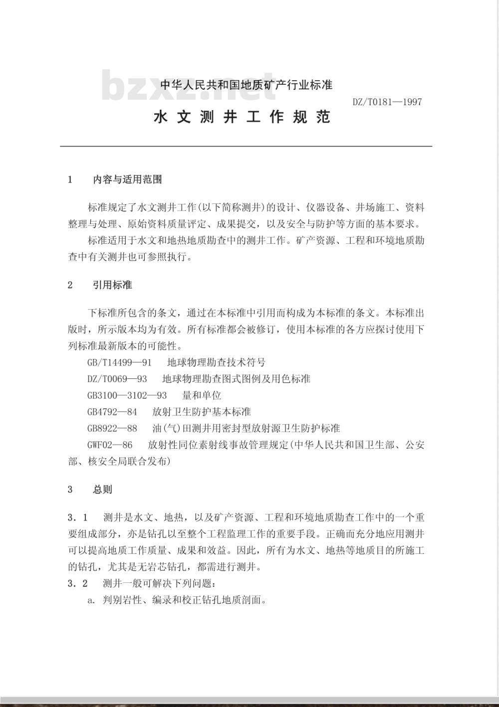 标准规定了水文测井工作(以下简称测井)的设计、仪器设备、井场施工、资料整理与处理、原始资料质量评定、成果提交,以及安全与防护等方面的基本要求。标准适用于水文和地热地质勘查中的测井工作。矿产资源、工程和环境地质勘查中有关测并也可参照执行。