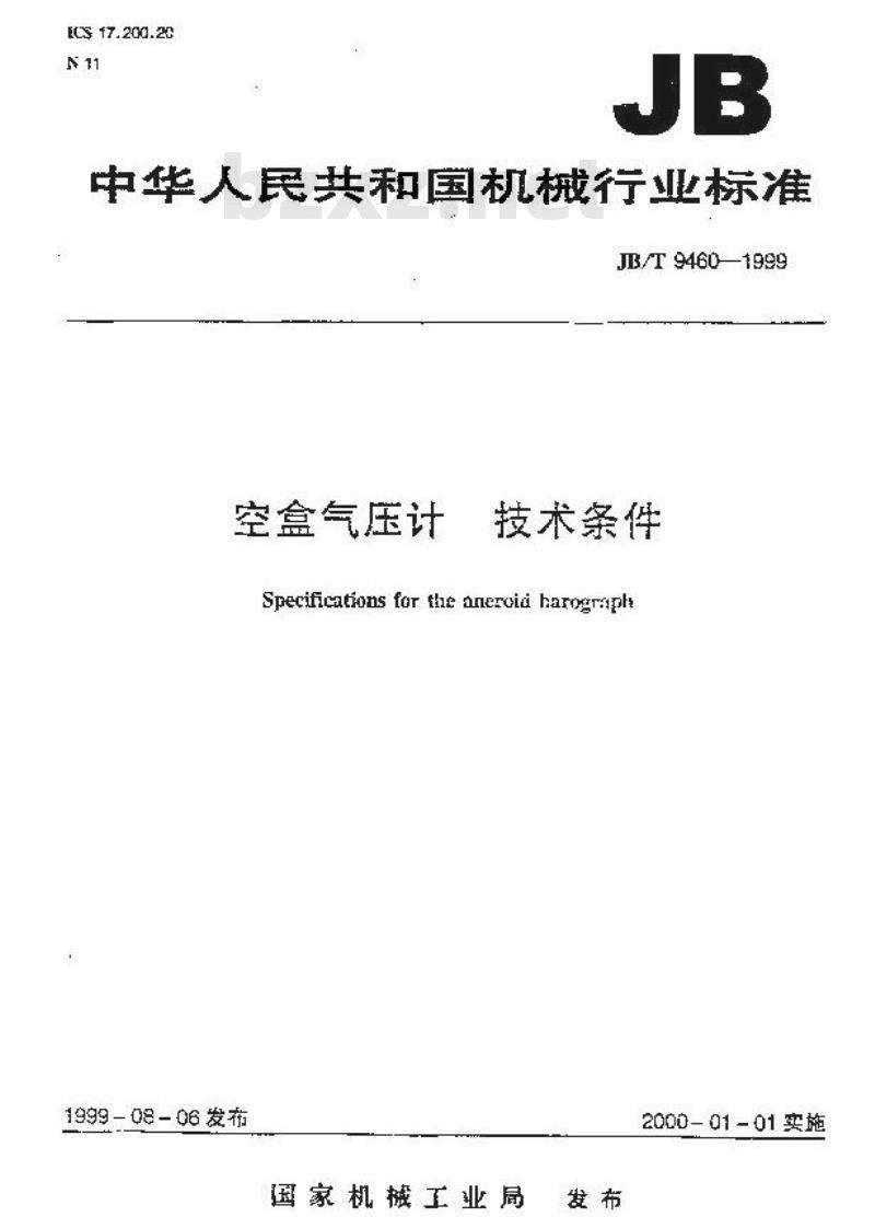 平行,其最大偏券不应超过相邻两时间标线间距的1/3(日记型)或1/4(周记型)。3.8打开气压计的外充取下自记钟时,收器整机不得帮倒。3.9气压计所用白记邦应符合B/T9452的规定。3,1,气出计各零部件的安获央正确,牢靠,不得有松脱、变形及其他影响使用的缺陷。3.11气压行各零部件所覆保护层应车固、均勾、光洁,不得有脱层、锈蚀等快陷。3.12仪器在运输包装的条件下,应特合JB/9329的要求。4试验方流