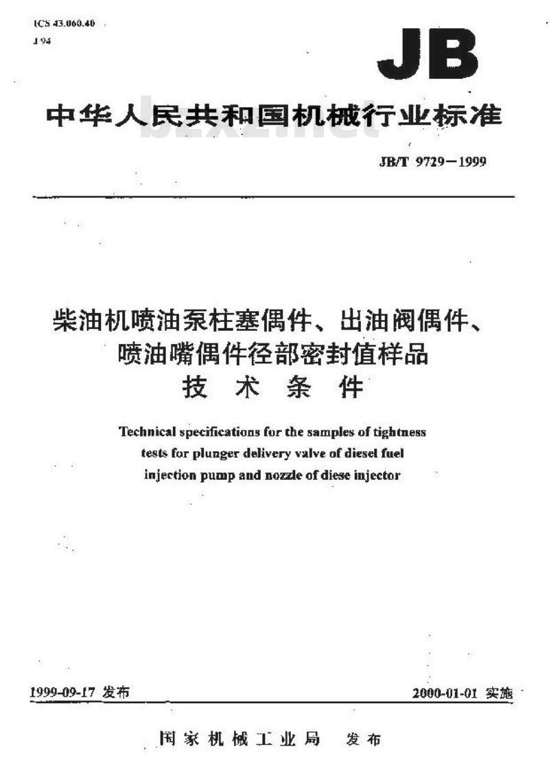 JB/T 9729-1999 JB/T 9729-1999 柴油机喷油泵柱塞偶件、出油阀偶件、喷油嘴偶件径部密封值样品 技术条件 JB/T9729-1999