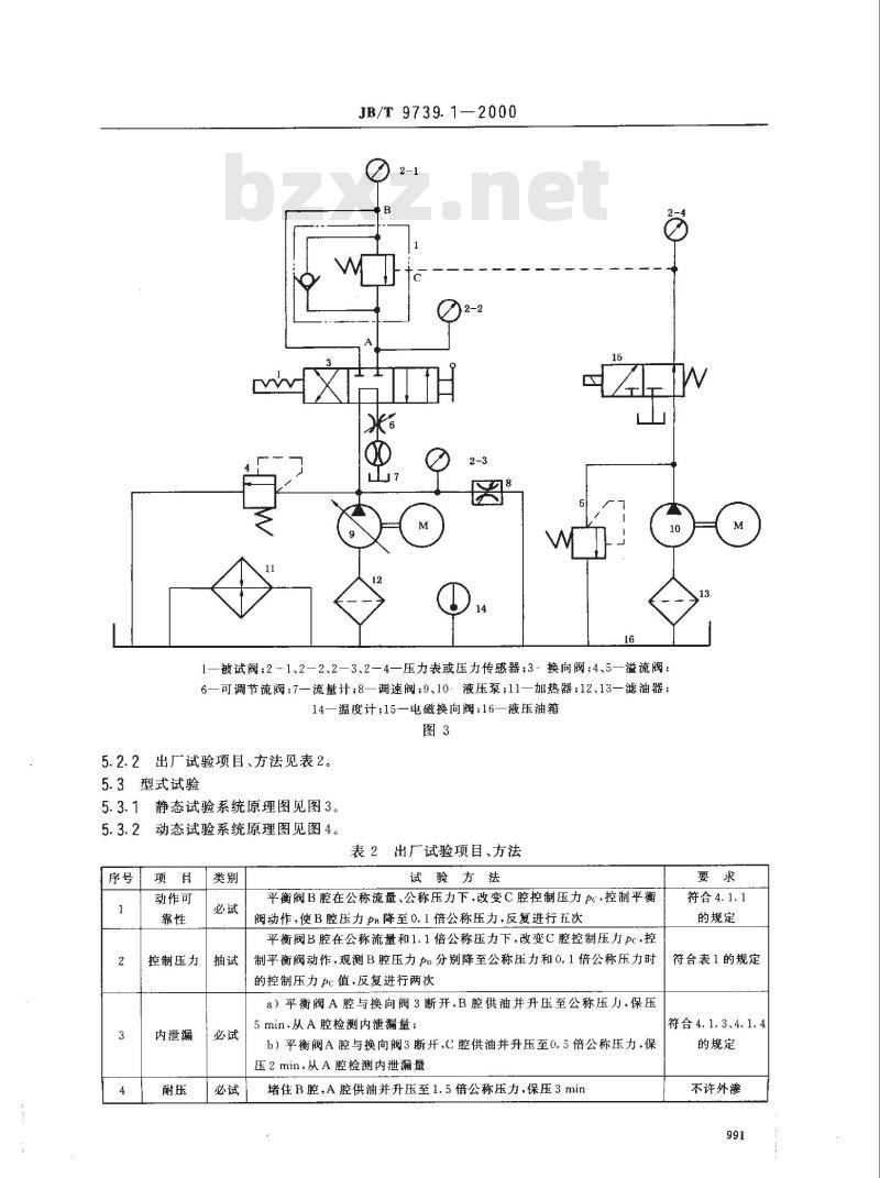 1—被试阀;2-1、2-2、2—3、2—4—压力表或压力传感器;3换向阀;4、5—溢流阀:6—可调节流阀:7—流量计;8—调速阀;9、10液压泵;11—加热器:12.13一滤油器;14—温度计;15—电磁换向阀:16—液压油箱图3