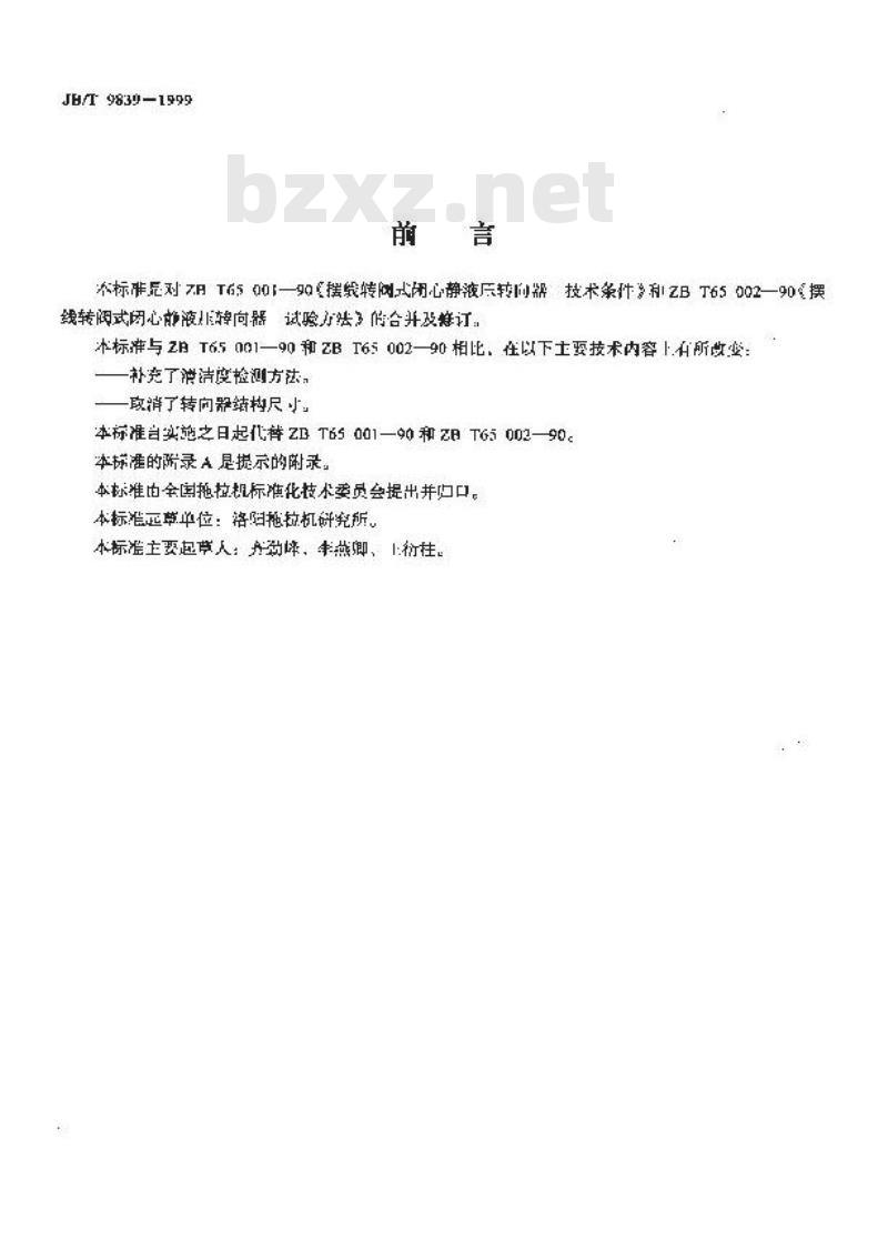 不标准后对7月T6500—90(摆袋转网式闭心静液后转器技术条件》和ZBT65002—90援线转阅式闭心静液转向器试验力法的合并及整订:本标准与ZT65001—90和2BT65002—90相比,在以下主要技术内容1有所改变:补究了泄洁度检测方法,