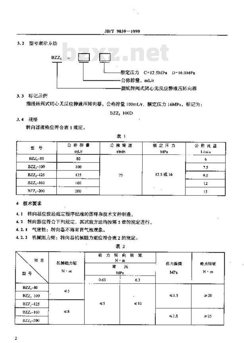 4.2.4压力振摆:转向据乐力暴摆减符合表2的规定。4.2.5整点转蛇:转向器终点转矩吨符合表2的规定。4.2.6中间位置泄漏:转间器中间位登泄稀母成符会表3的规定。4.2.7乐力损失:转向器玉力损失应符合者3的规定。4.2.静压差:转间器A、B两工作口(以下商称口)的静压差应符合表3的规定。4.2.9