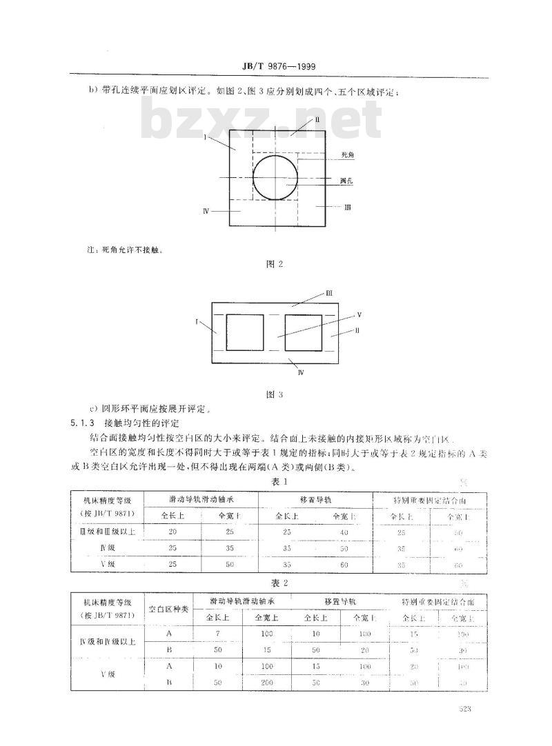 结合面接触均勾性按空区的大小来评定。,结合面上未接触的内接矩形区域称为窄门区空自区的宽度和长度不得同时大于或等于表1规定的指标;同时人于或等于表2规定指标的入类或1类空白区允许出现一处,但不得山现在两端(A类)或两侧(B类)。表1