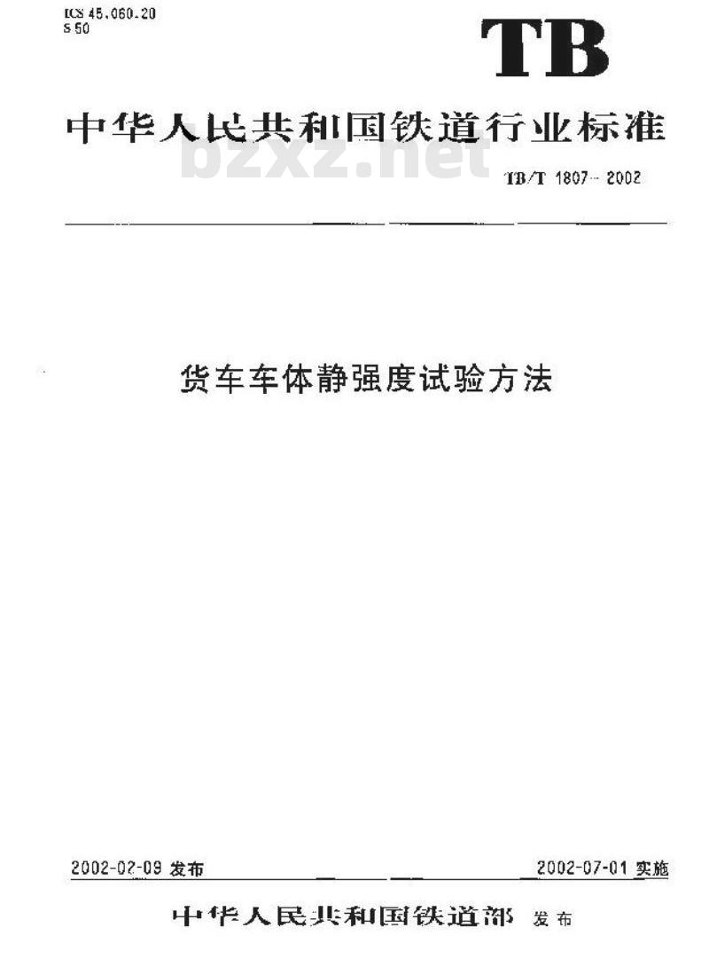 本标准规定了铁道货车车体静强度试验的项目内容、设备仪表及试验评定方法。本标准适用于最高运行速度不大于120k m/h,列车牵引总重不大于60 00t,运煤专线100 00t 及其以上,轴重不大于25t的铁路标准轨距新造通用货车。其他货车可参照使用 TB/T 1807-2002 货车车体静强度试验方法 TB/T1807-2002