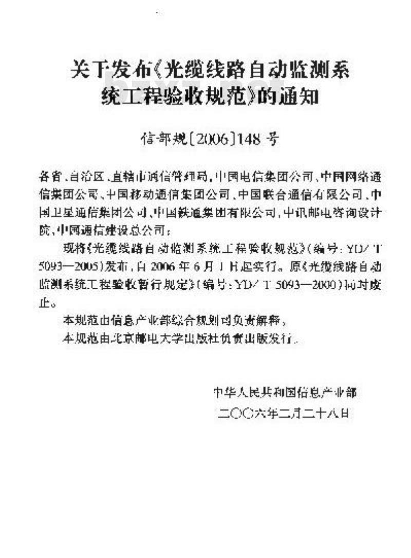 求规范尼据据倍良产业帮“关上安排通信工择资设标准慢订和制定让划的通知信部规函20040%的要求,对原中忧人民共新国通信行业标准YD/T5093—3m光缆线路自动监测累给工程检收费行规定进了悠计本规范十要纠拓光缩线路白动监测系统的安装利统线·市放原聊监测设备不炉测试皮系统测试的验收指探等:本股范月黑体字标注的条文为强制性条文,必须严格执行本规范由息产业部综台规划司免资解释监普执行,规施在使用过程中,如有需要补充或收的内穿,谐部综合规划司联系,好将补充成修政意见寄部综合现划叫(地址:北京市西长安街[3号.邮编:1微4】