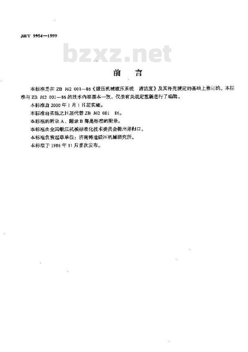 本标准总在ZD162001—86锻压机械液压系统清箔度及其补充规定的基础上燃的,本标筛与 Z [62 001一86 的技术内容基:本一致,仅要有关规定重新进行了缩辑。不标自2000年1月1H起实施。
