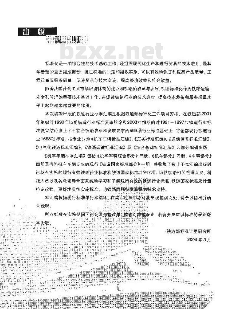 本次编渠版的铁道行业标准汇编是根据铁道部标准化工作项月安排,在数造部2001年组织刘1990年以前钦道行业标注复审纟论2009年组织的对1991-1997年道行业标准复中结论废止?不符合铁路改卓发展要求的96日预行单标准基础上将全部现行铁道行立16B8-预标准,按专业分为《机车车辆标准汇编#、《三务标准汇编,通信信号标准汇编及《口气化铁道标准汇编》,或铁路运翁标准氵编》及《综合基础弥准汇编》六部分编辑出版机车车辆标准汇编》包括&机立军辆综合部彭分”三册,机车部分》四册,《车辆部分》四册及有※机三车辆专业的玩行《铁道国家标准部分一册,共收集了截上下本汇编出版时已发个实就的现行有效铁逆行业标准和铁造国家标准专47项,以供钦路相关管理人员,科技人具以及各级领导全面系统地学习和了解现行效的铁行非标准、道国家标准及计量检定规程,更好净更倒实施标准,为铁路的料发展越供术女持,本汇编板据现行标准单行本踪率:究端印过端典办测能出现错误之:请于以指出并函告我所