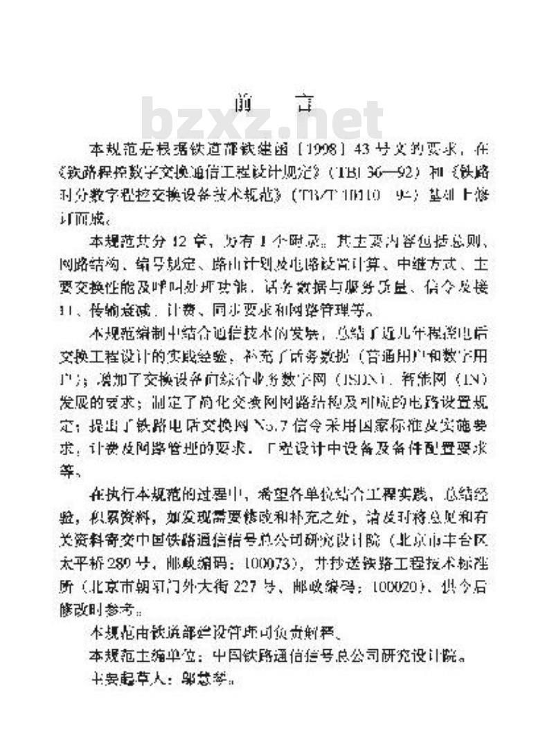 本规范适用于新建、改建长途交换网和本地交换网中的程控电话交换设备工程的设计。 TB 10036-2000 铁路时分数字程控电话交换工程设计规范(附条文说明) TB10036-2000