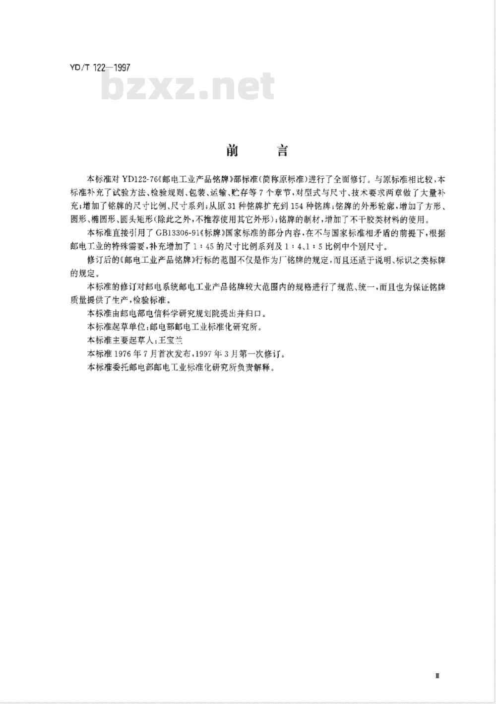 主题内容:本标准规定了邮电工业产品铭牌的型式、尺寸规格和技术条件。适用范围:本标准适用于为邮电工业产品配置厂铭牌、操作指示、说明标识、警示等标牌(总称铭牌)。 YD/T 122-1997 邮电工业产品铭牌 YD/T122-1997
