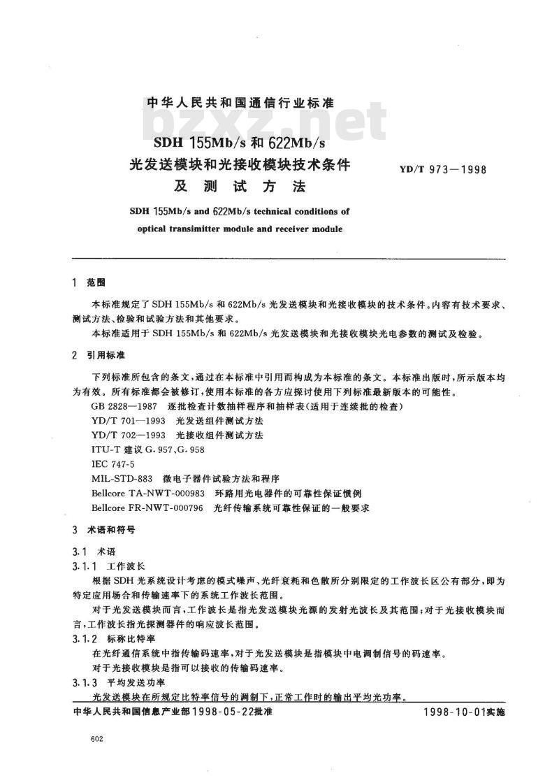 - YD/T 973-1998 SDH 155Mb/s和622Mb/s光发送模块和光接收模块技术条件