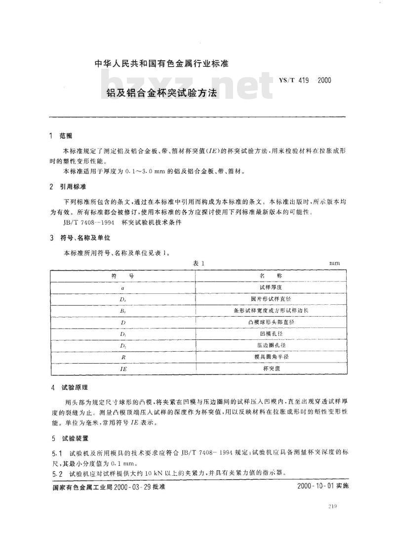 - YS/T 419-2000 铝及铝合金杯突试验方法