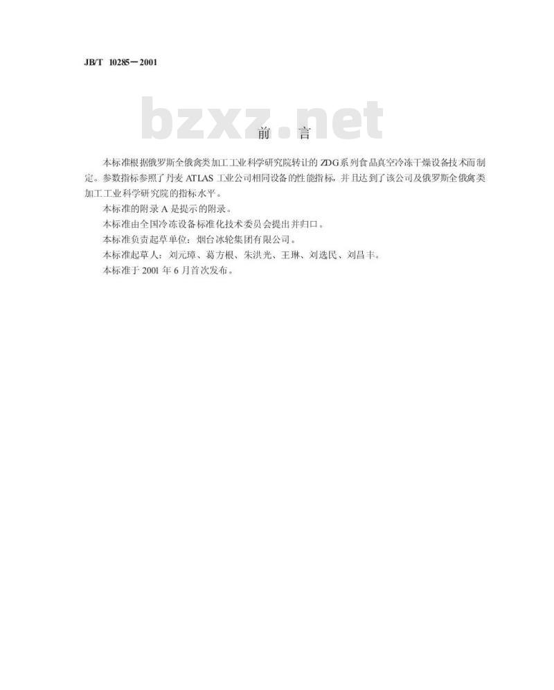 JB/T 10285—2001 本标准根据俄罗斯全俄禽类加工工业科学研究院转让的ZDG系列食品真空冷冻干燥设备技术制订,参数指标参照了丹麦ATLAS工业公司相同设备的性能指标。 本标准规定了间歇式食品真空冷冻干燥设备的型式与基本参数,技术要求,试验方法,检验规则,标志、包装和贮存。 本标准适用于间歇式食品真空冷冻干燥设备。连续式冻干设备、非志套性冻干设备可参照执行。 本标准于2001年6月首次发布。 JB/T 10285-2001 食品真空冷冻干燥设备 JB/T10285-2001