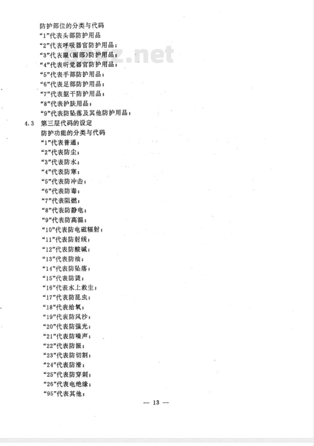 劳动防护用品性质的分类与代码a.特种防护用品,以\1\表示;b.一般防护用品,以“0”表示。4.2第二层代码的设定