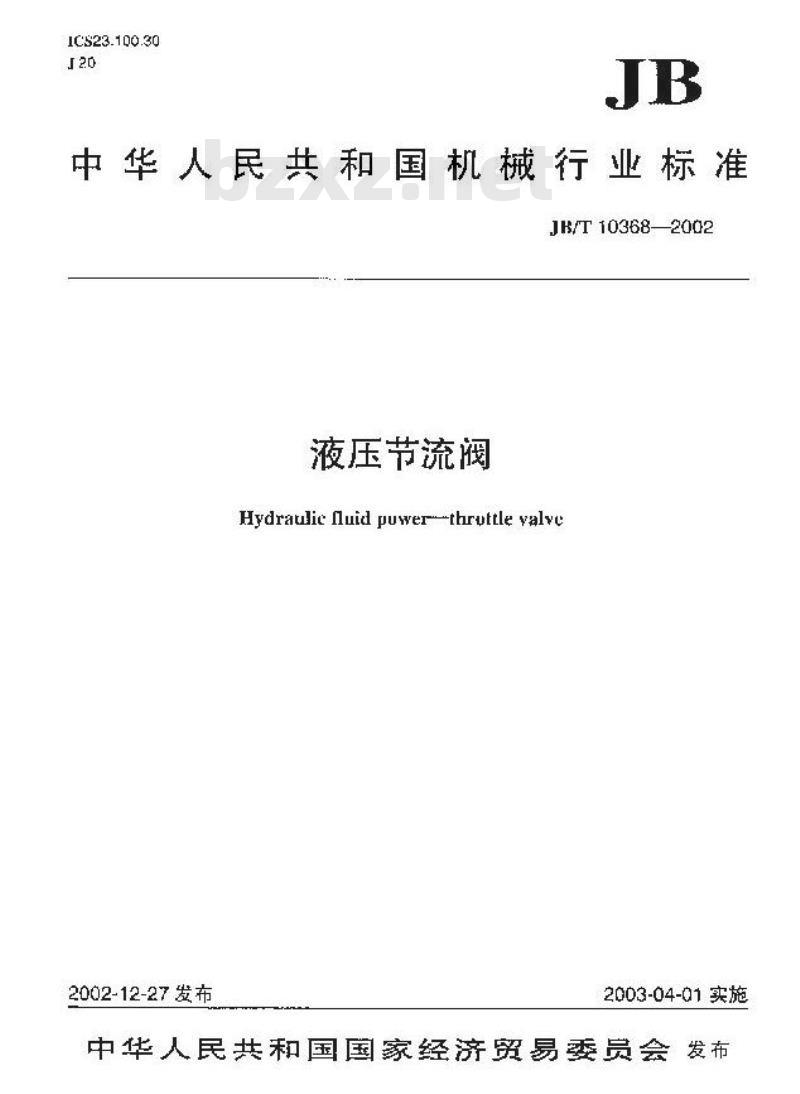 本标准规定了液压节流阀、单向节流阀、行程节流阀和单向行程节流阀的基本参数、技术要求、试验方法、检验规则和标志、包装运输和贮存等要求。 JB/T 10368-2002 液压节流阀 JB/T10368-2002
