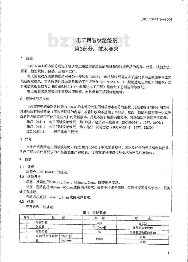 JB/T10441的本部分规定了制造电工用皱纹绝缘纸的基材和皱纹纸产品的名称、代号、试验方法、要求、检验规则、包装、运输和贮存。电工用皱纹绝缘纸的制造可分为一步法和二步法。一步法皱纹纸是以未干燥的平网基纸为中间工艺制造的皱纹纸,它所用的纤维及制备纸的工艺应符合EC60554-3-1《一般用途电工用纸》的要求:二步法皱纹纸是以符合IEC60554-3-1《一般用途电工用纸》经起皱工艺制造的皱纹纸。电工用皱纹纸主要用于油浸式变压器、电抗器和互感器绕包绝缘。2规范性引用文件