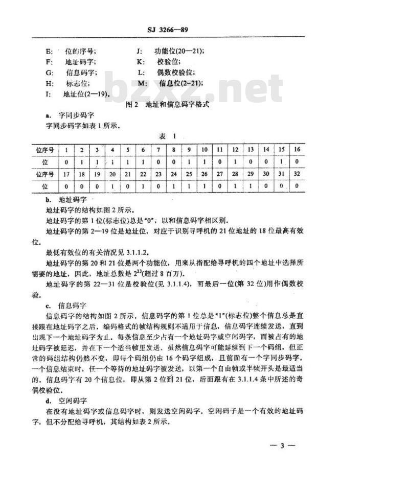在没有地址码字或信息码字时,则发送空闲码字,空闲码子是一个有效的地址码字,但不分配给寻呼机,其结构如表2所示。3