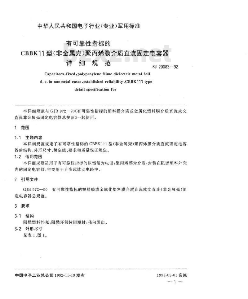 - SJ 20083-1992 有可靠性指标的CBBK111型(非金属壳)聚丙烯膜介质直流固定电容器详细规范