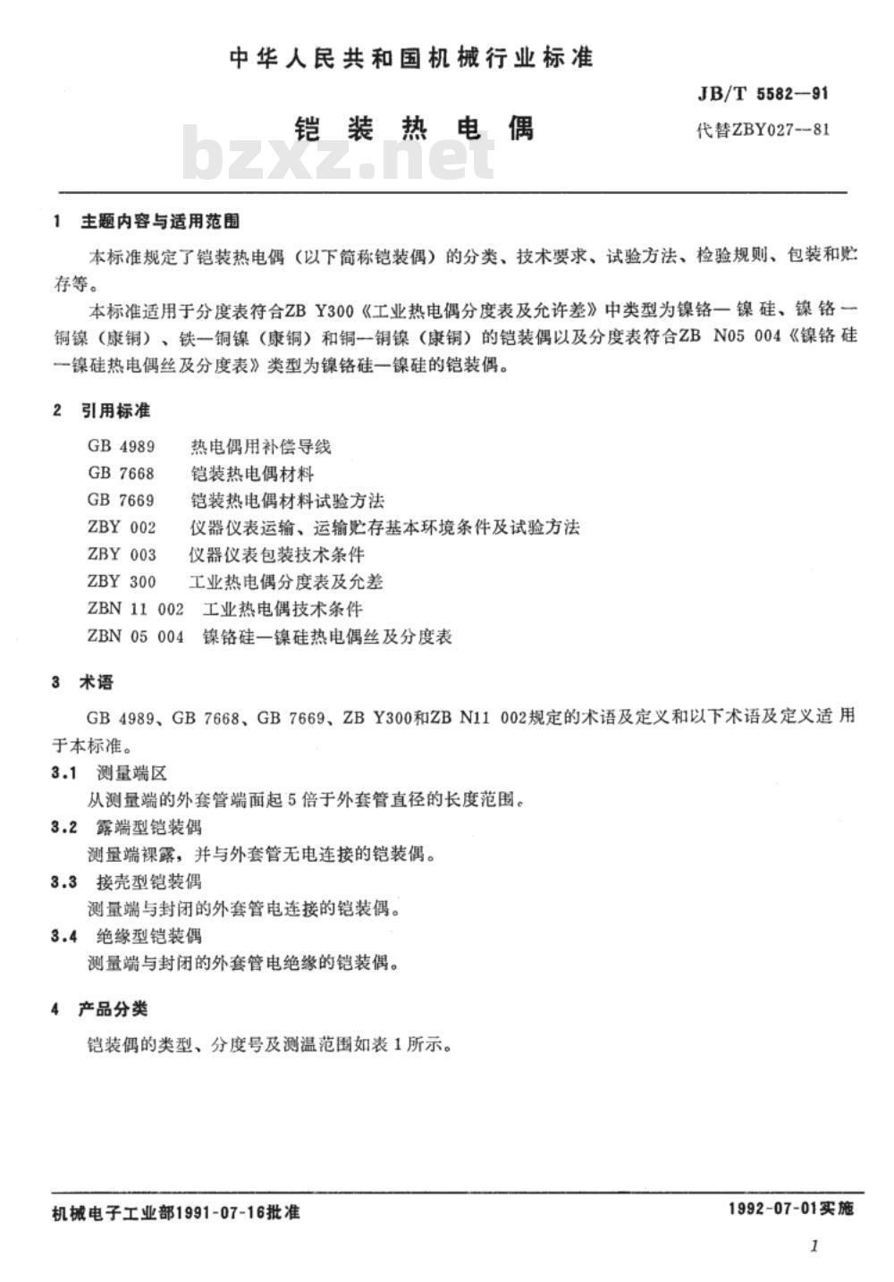 铠装偶的类型、分度号及测温范围如表1所示。机械电子工业部1991-07-16批准1992-07-01实施