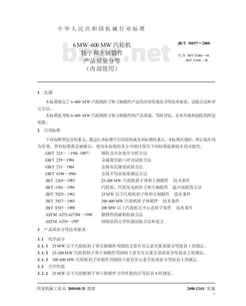 - JB/T 50197-2000 6MW~600MW汽轮机转子和主轴锻件 产品质量分等