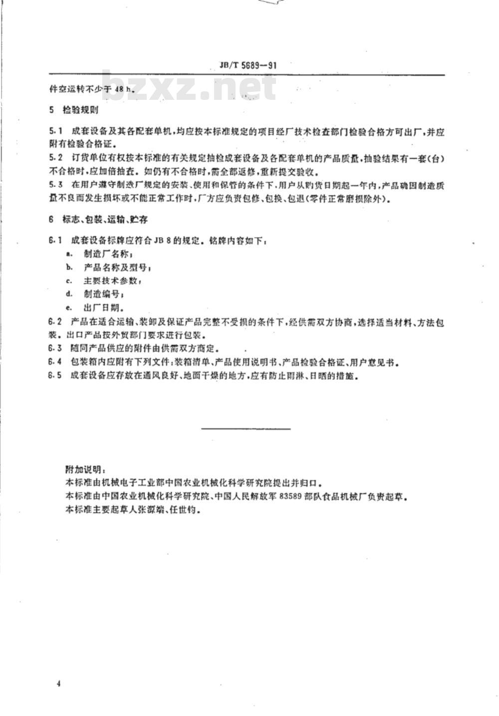 本标准由机械电子工业部中国农业机械化科学研究院提出并归口。本标准由中国农业机械化科学研究院、中国人民解放军83589部队食品机械厂负贵起草,本标准主要起草人张源端、任世钧.中华人民