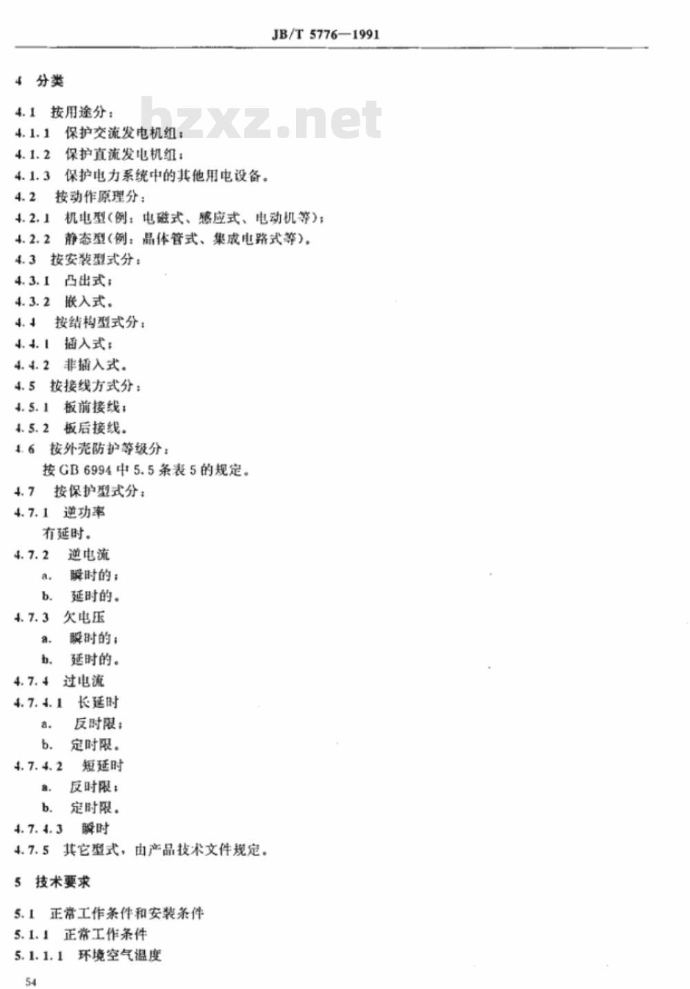 本标准参照采用IEC 92(1980)以及IEC 255的有关要求。 本标准规定了船舶电力系统用保护继电器的产品分类、技术要求、试验方法、检验规则和标志、包装、运输、贮存等内容。 本标准适用于供电压为1000V及以下的交流和直流船舶电力系统中作保护用的继电器。 本标准不适用于热继电器和非电量测量的二次电气保护。 JB/T 5776-1991 船用保护继电器 JB/T5776-1991