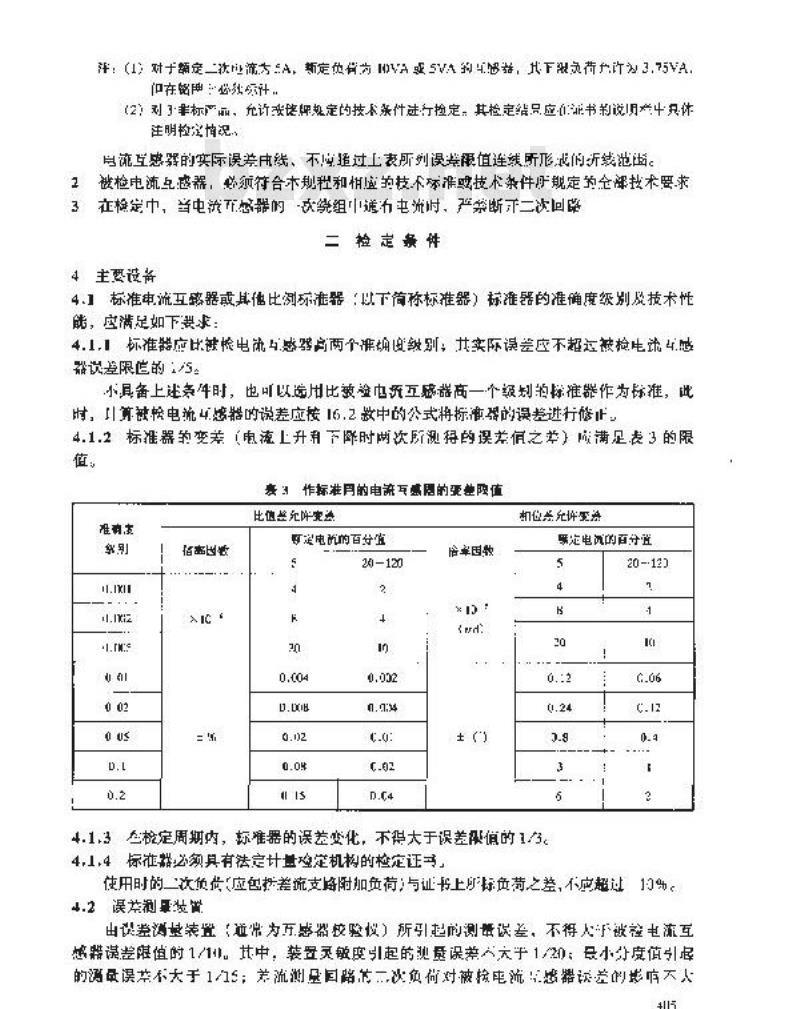 小具备上述多牛时,也可以选用比效签吗近互感器高一个级划的探推器作为标准,此时,算被检电流4感器的说差应接16.2数中的公式将标追蛋的误差进行修止,4.1.2标准器的变差(电流上升用下降时两次所视得的误差之举)成满足表3的限值。