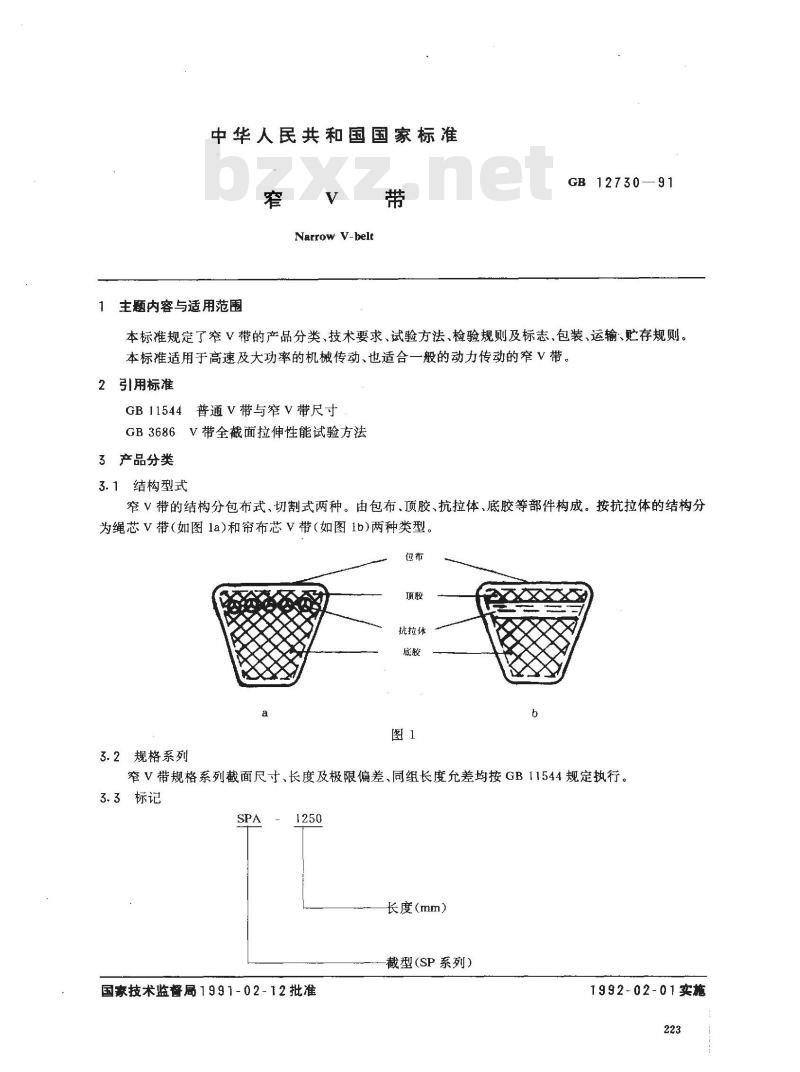 窄V带规格系列截面尺寸、长度及极限偏差、同组长度允差均按GB11544规定执行。3.3标记