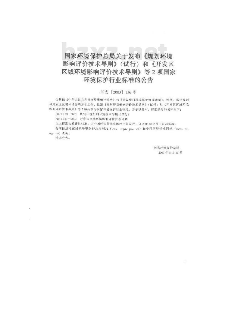 为贯彻中华人民共和国环境影响评价法》和《注设取几环境保护普理条例,规范、指导规划和开发区区域环境影响详价工作,批准《规划环竞影响评价技术导则》(试行)和多工发区区域环境影旁评价技术导则》等2项标准为国家环境保扩行业标准,并子以发布。标准综号和名移如下:HI/T130-2003热训环境影响半价技术导则(减行)HJ/T131-2003开发区K城环境影响评价技术导则以上标准为推荐性标准,再中国环境科学山版社出版发行,白2003年9月1日起实施:标准信息可在国家环境保护总局网站(ww:ara.Bw:n)和中同环战标准网站(www:org:cen)ie
