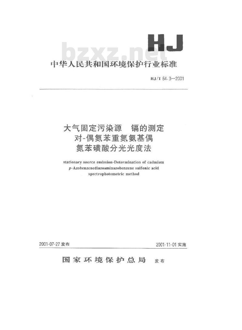 HJ/T 64.3-2001 大气固定污染源 镉的测定 对-偶氮苯重氮氨基偶氮苯磺酸分光光度法 HJ/T64.3-2001