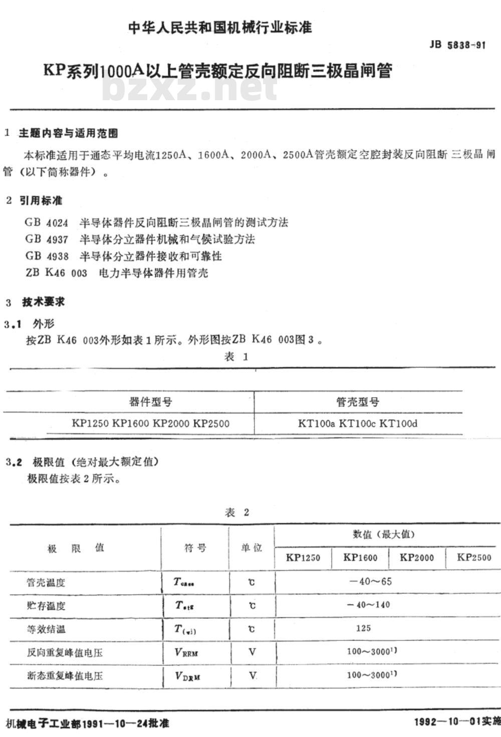 本标准适用于通态平均电流1250A、1600A、2000A、2500A管壳额定空腔封装反向阻断三极晶闸管。 JB/T 5838-1991 KP系列1000A以上管壳额定反向阻断三极晶闸管 JB/T5838-1991