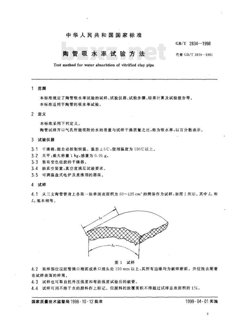 - GB/T 2834-1998 陶管吸水率试验方法