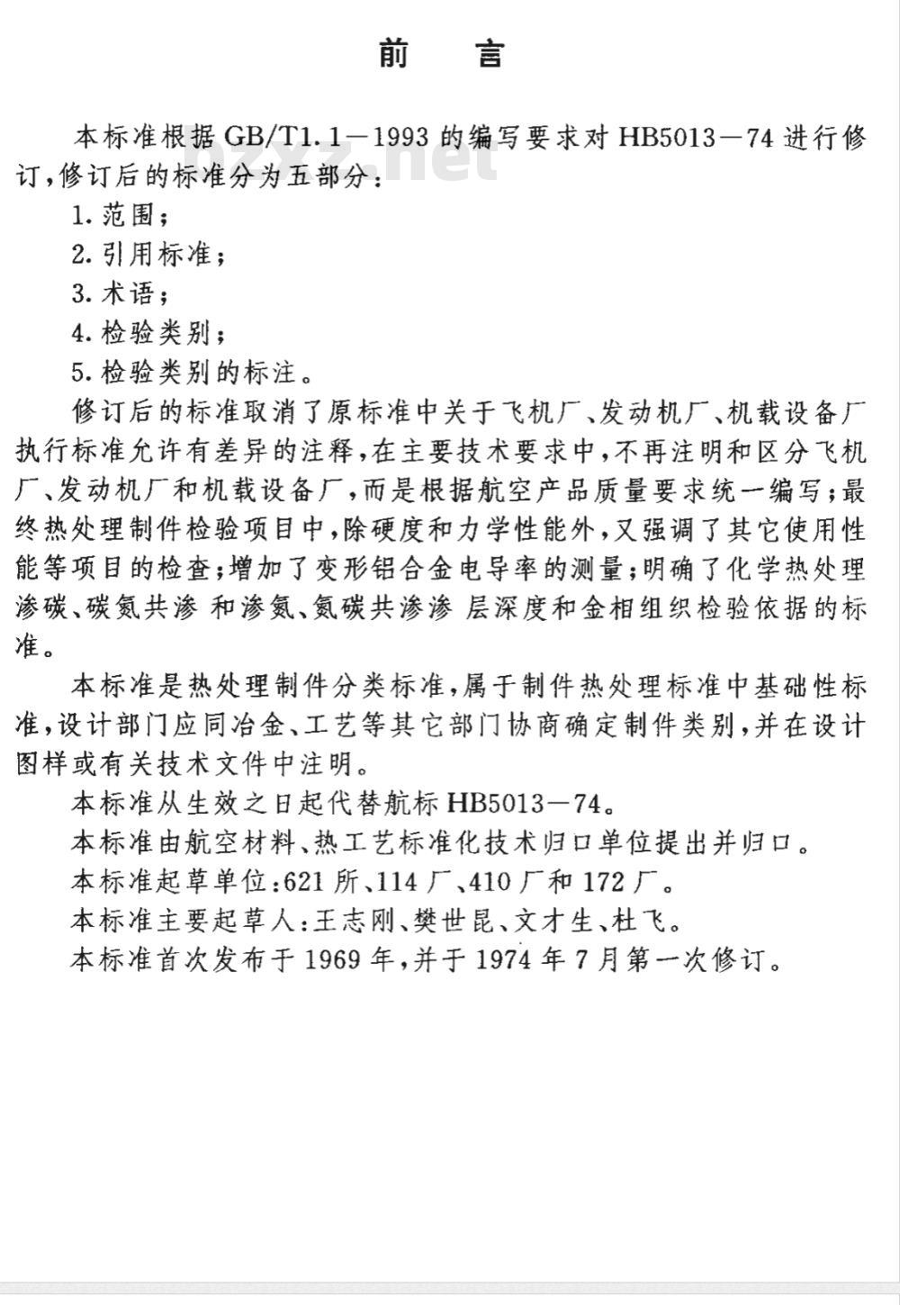 本标准从生效之日起代替航标HB5013一74。本标准由航空材料、热工艺标准化技术归口单位提出并归口。本标准起草单位:621所、114厂、410厂和172厂。本标准主要起草人:王志刚、樊世昆、文才生、杜飞。本标准首次发布于1969年,并于1974年7月第一次修订。1范围