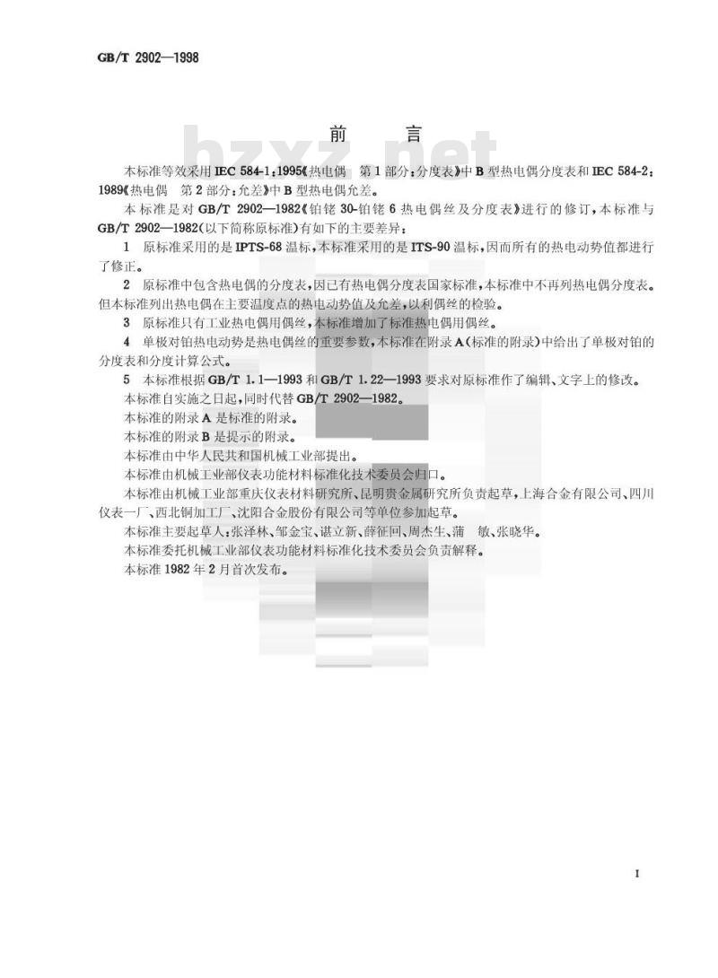 本标准等效采用IEC584-1:1995《热电偶第1部分:分度表》中B型热电偶分度表和IEC584-2:1989《热电偶第2部分:允差》中B型热电偶允差。本标准是对GB/T2902—1982《铂30-铂佬6热电偶丝及分度表》进行的修订,本标准与GB/T2902—1982(以下简称原标准)有如下的主要差异:1原标准采用的是IPTS-68温标,本标准采用的是ITS-90温标,因而所有的热电动势值都进行了修正。