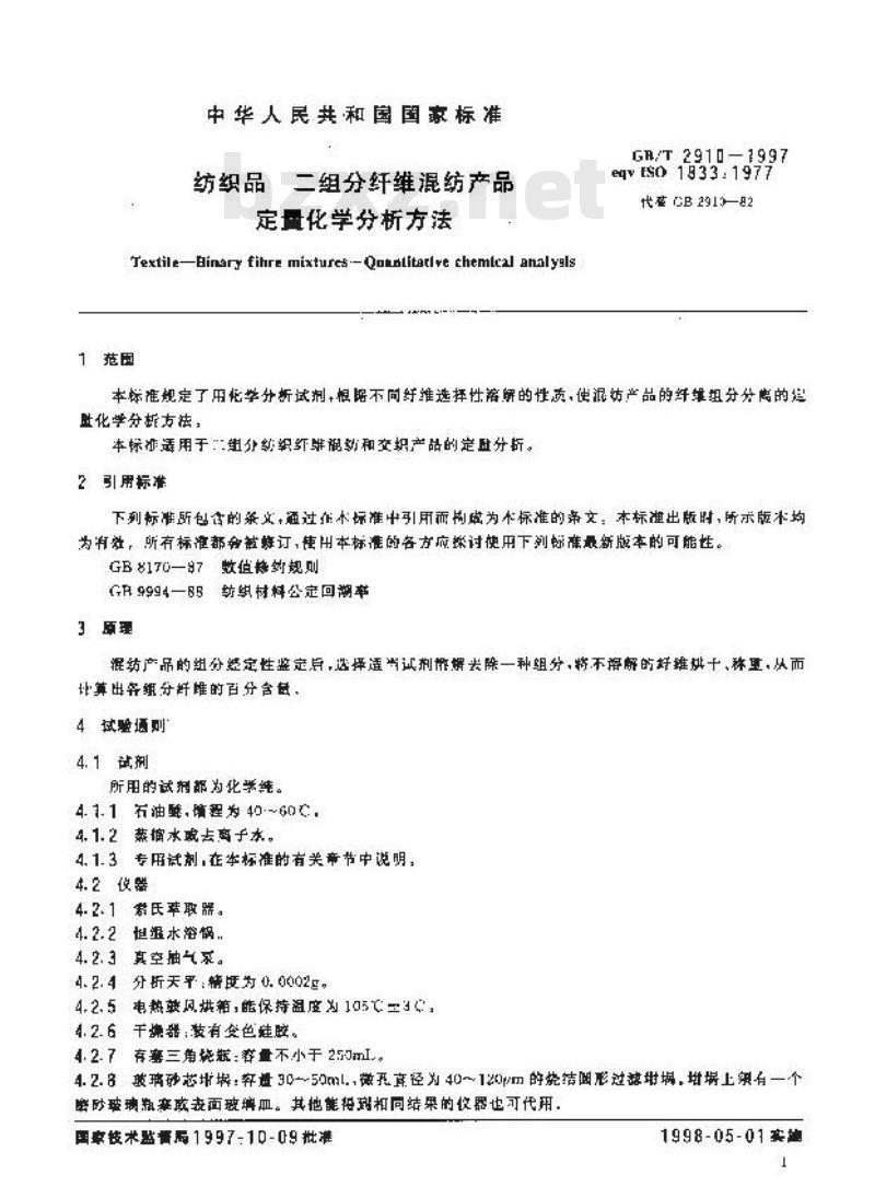 - GB/T 2910-1997 纺织品 二组分纤维混纺产品 定量化学分析方法
