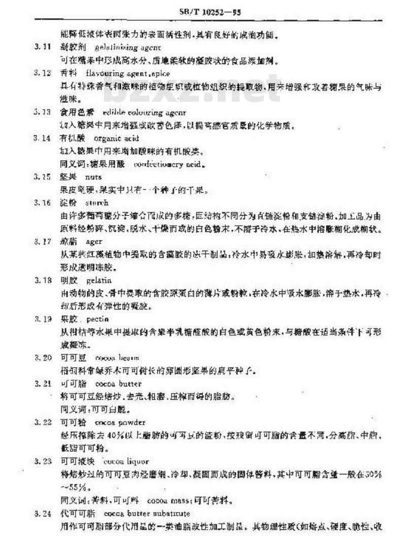 同义等料,可可降caco们s;可可著料。3.24代可可脂cocoabuttergubstirute用作可可服部分代用品的一类油脂改性加工制品。其物理性项(如熔点、硬度、瞻检,收缩性等>与天然可可脂相似,但化学组成与树型与下然可可胆不同,且缺少多晶持性。SB/T 10252.--95