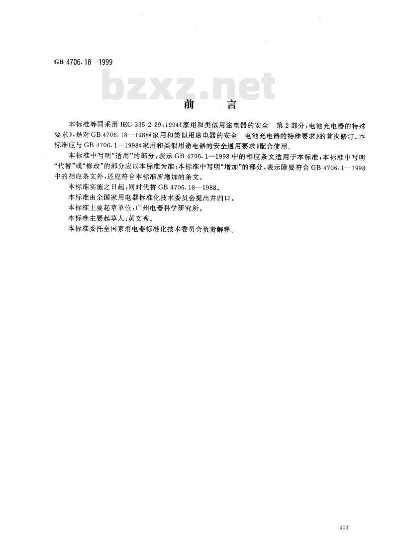本标准等同采用IEC335-2-29:1994《家用和类似用途电器的安全第2部分:电池充电器的特殊要求》,是对GB4706.18一1988《家用和类似用途电器的安全电池充电器的特殊要求》的首次修订。本标准应与GB4706.1-1998《家用和类似用途电器的安全通用要求》配合使用。本标准中写明“适用\的部分,表示GB4706.1一1998中的相应条文适用于本标准;本标准中写明“代替”或“修改”的部分应以本标准为准;本标准中写明“增加”的部分,表示除要符合GB4706.1一1998中的相应条文外,还应符合本标准所增加的条文。本标准实施之日起,同时代替GB4706.18—1988。本标准由全国家用电器标准化技术委员会提出并归口。本标准主要起草单位:广州电器科学研究所。本标准主要起草人:黄文秀。