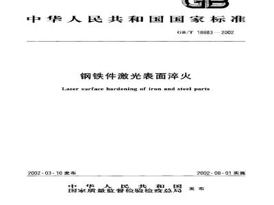 本标准规定了钢铁件激光表面淬火设备的特殊要求,激光表面淬火常用钢铁件的原始状态,以及激光表面淬火的工艺控制、质量控制、质量检验与劳动保护的基本要求。本标准适用于钢铁件激光表面淬火。 GB/T 18683-2002 钢铁件激光表面淬火 GB/T18683-2002 本标准规定了钢铁件激光表面淬火设备