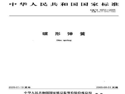 本标准规定了截面为矩形的碟形弹簧(以下简称碟簧)的结构型式、尺寸系列、技术要求、试验方法、检验规则和设计计算。本标准适用于普通矩形截面碟簧。本标准不适用于梯形截面碟簧、开槽形碟簧和膜片碟簧。 GB/T 1972-2005 碟形弹簧 GB/T1972-2005