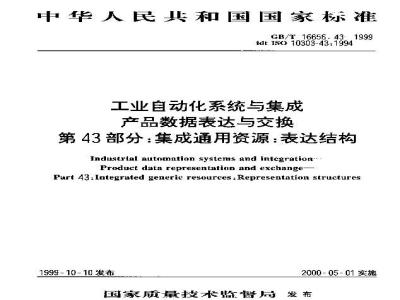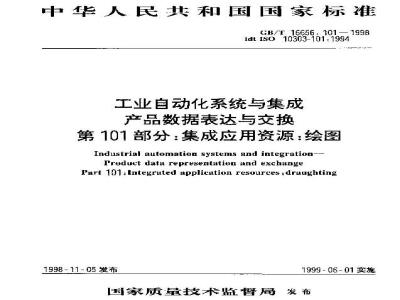 GB/T 16656中的101部分规定了表达绘图信息的资源构成,其范围如下:关于图样和图纸的定义、描述及管理信息;关于产品和图样注释的基本绘图注释以及它们与描述事实及需求的更一般注释的组合;用于描述尺寸、公差及有关测量尺寸信息的绘图注释。 GB/T 16656.101-1998 工业自动化系统与集成