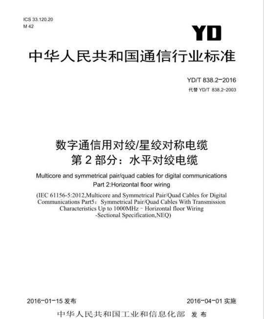 代替 YD/T 838.2-2003 数字通信用对绞/星绞对称电缆 第2部分:水平对绞电缆