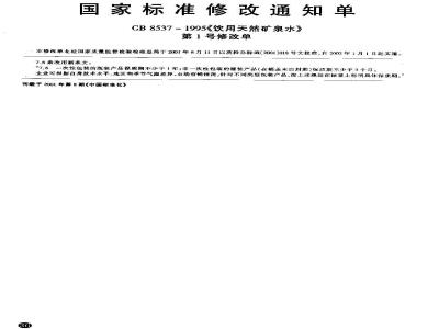 本标准规定了饮用天然矿泉水的水源及产品的技术要求、检验规则和标志、包装、运输、贮存要求。本标准适用于饮用天然矿泉水的水源水及其灌装产品。? GB 8537-1995 饮用天然矿泉水 GB8537-1995