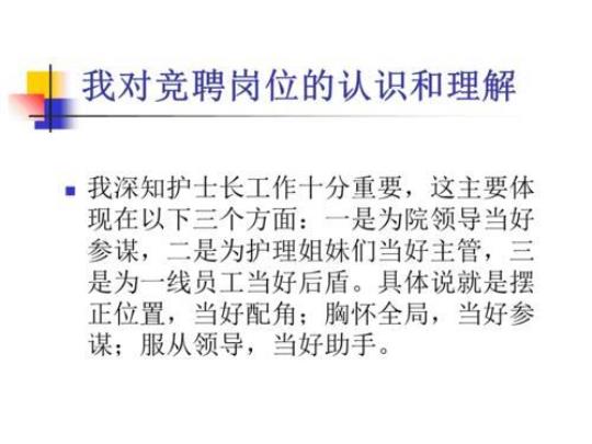 我叫,今年岁,学历。年月的时候,我怀着现代南丁格尔的梦想来到本院,至今个年头了。在这期间,我从未间断过业余学习,在临床中我用理论指导实践,再用实践来检验理论,从中我找到了学习的乐趣,找到了知识的差距,找到了工作的目的。面对竞聘护士长这个岗位,我想自身有如下特点和优势: