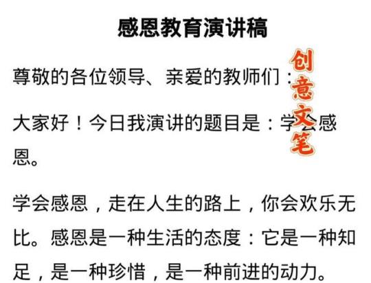尊敬的老师,亲爱的同学们: 大家晚上好! 时间过得可真快,从毕业到现在已经过了5个年头了,进入队伍也有1年多了,回顾起磕磕绊绊的这一路足迹,唯有感恩铭记心头。 一、感恩工作 在经历了前四年无数的挫折与努力后,20xx年我幸运的进入xx队。在这里我得到了更多的成长和提高,也使我更加明白:感恩,最重要的是感恩工作。正是这份工作为我提供了生存必须的稳定物质条件,可以让心安定下来,驱除了社会漂泊感;正是这份工作,让我遇到了悉心指导栽培自己的三位领导,无私关心帮助自己的各位同事,享受到了团结和谐大家庭的温馨与激励;正是这份工作给予了我成长的平台,珍贵的经验、良好的训练、才能的表现和品格的建立。 工作教给我如何感恩,感恩又源于良好的工作心态。一颗感恩的心会使我们的工作愉快非凡,懂得感恩和珍惜不仅是做人的本分,也是获得事业成功和人生幸福的大智慧。 二、尽责工作 感恩需要我们高质量的履行起自己的职责,如果把单位看作是一台正在运转的机器,我们每一位员工都是机器上的零部件,大到齿轮,小到螺丝钉,惟有承担起自己的责任,才能保证机器的有效运转。从我自身来说,做为办公室的一员,要扎实打好各项基本功,调整积极地工作态度,努力做好后勤服务工作,提升自己作为领导助手的各项能力,勇于承担,拒绝借口。 天地生人,有一人应有一人之业;人生在世,生一日当尽一日之勤。只要我们以积极的态度,尽职尽责的心面对工作,创新工作方法,积累经验,为工作挥洒自己的光和热,这就是感恩。 三、奉献工作 感恩,需要……(
