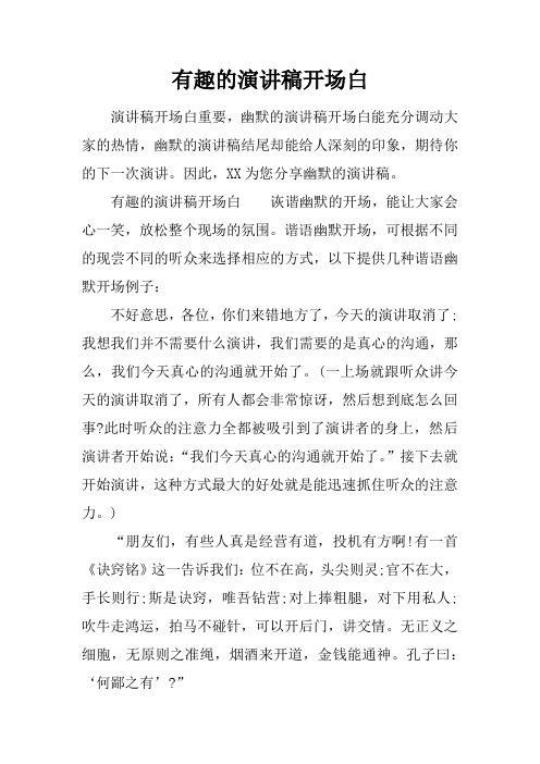 在现实社会中,需要用到开场白的场合越来越多,开场白有点明主题、交代背景、提出问题等作用。那么问题来了,如何写好开场白呢?以下是小编整理的经典演讲稿开场白,供大家参考借鉴,希望可以帮助到有需要的朋友。