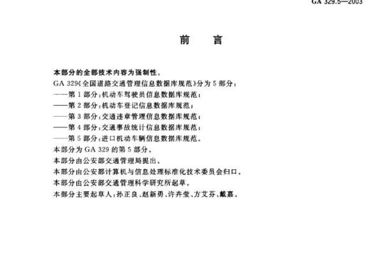 GA 329.5-2003. 1范围 GA 329.5规定了进口机动车计算机核查系统的数据库表的基本内容。 GA 329.5适用于全国进口机动车计算机核查系统。 2规范性引用文件 下列文件中的条款通过GA 329的本部分的引用而成为本部分的条款。凡是注日期的引用文件,其随后所有的修改单(不包括勘误的