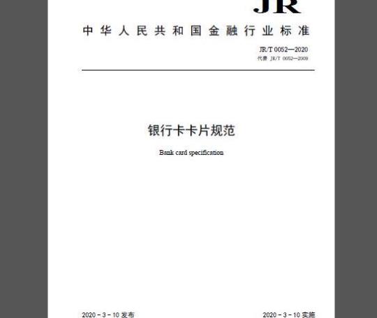 标准号:JR/T 0052-2020 标准名称:银行卡卡片规范 英文名称:Bank card specification 标准格式:PDF 发布时间:2020-03-10 实施时间:2020-03-10 标准大小:792K 标准介绍:本标准规定了银行卡的卡片外形及尺寸、卡面设计要素、卡片介质、卡片物