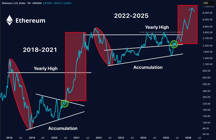 在另一份分析中,Merlijn The Trader对比了以太坊2022-2025年与2018-2021年突破阶段的形态相似性。他强调自2020年以来支撑以太坊的长期上升趋势线,指出价格近期在该趋势线附近反弹后,现已重新进入2400美元左右的更高交易区间。