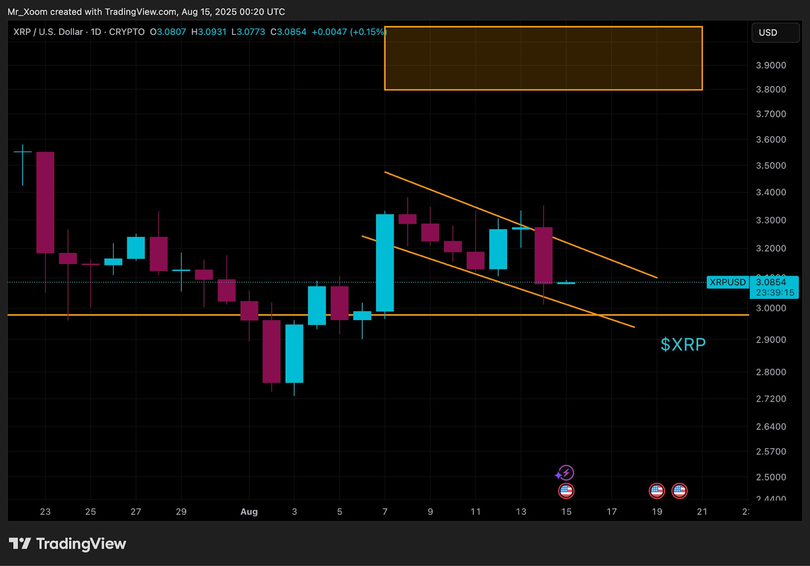 该区域对维持当前看涨结构至关重要。若突破下降通道,价格可能冲击 3.80–3.90 美元区间;反之若跌破 3.00 美元,XRP 或在测试 2.90 美元后反弹。