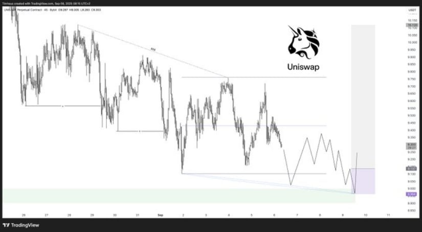 分析师Tim Heus在最新推文中指出,UNI始终未能突破下降阻力线,多次尝试突破未果。价格走势形成连续降低的高点,证实9.70至9.90美元区间存在持续抛压。而9.00美元附近支撑位经受住多次考验,成为阻止币价进一步下探的关键防线。