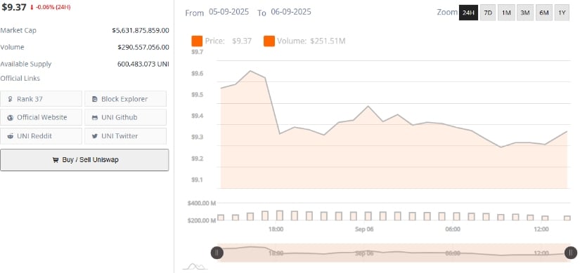 BraveNewCoin图表显示UNI现报9.37美元,较日内高点9.60美元有所回落。24小时内最低触及9.20美元,彰显其在下行压力中的韧性。当前市值锁定56.3亿美元,稳居加密资产前四十之列。
